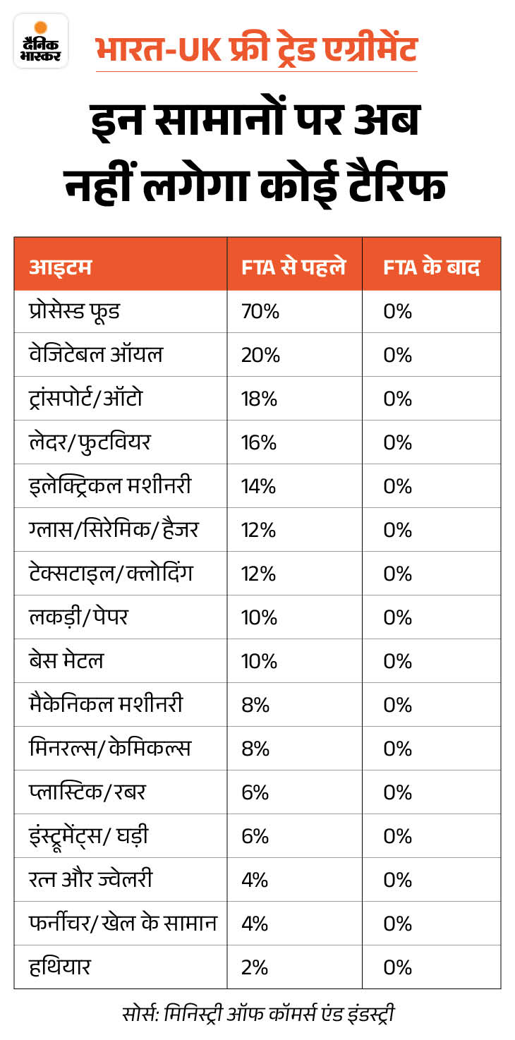 फ्री ट्रेड एग्रीमेंट के बाद भारत के 99% सामानों को UK में जीरो टैरिफ पर निर्यात किया जाएगा। वहीं यूके के 99% सामान 3% एवरेज टैरिफ पर आयात होंगे।