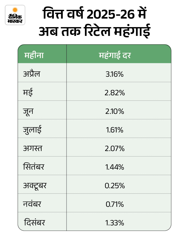नवंबर में रिटेल महंगाई बढ़कर 1.33% हुई दिसंबर में रिटेल महंगाई पिछले महीने के मुकाबले बढ़कर 1.33% के स्तर पर पहुंच गई है। ये तीन महीनों का हाई लेवल है। इससे पहले नवंबर में ये 0.71% पर थी। वहीं अक्टूबर में ये 0.25% पर थी, जो 14 साल में सबसे कम स्तर था।